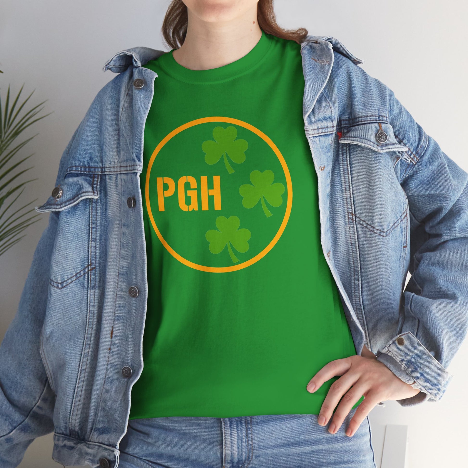 Rep the Steel City with a lucky twist. This t-shirt features a bold circle emblem with the initials “PGH” and three Irish shamrocks, a playful nod to the iconic Pittsburgh-style steel logo—perfect for anyone who loves Pittsburgh and a little Irish charm. Whether you’re celebrating St. Patrick’s Day, heading to a game, or just showing off your hometown pride, this tee brings together Pittsburgh grit + Irish luck in one clean, classic design.